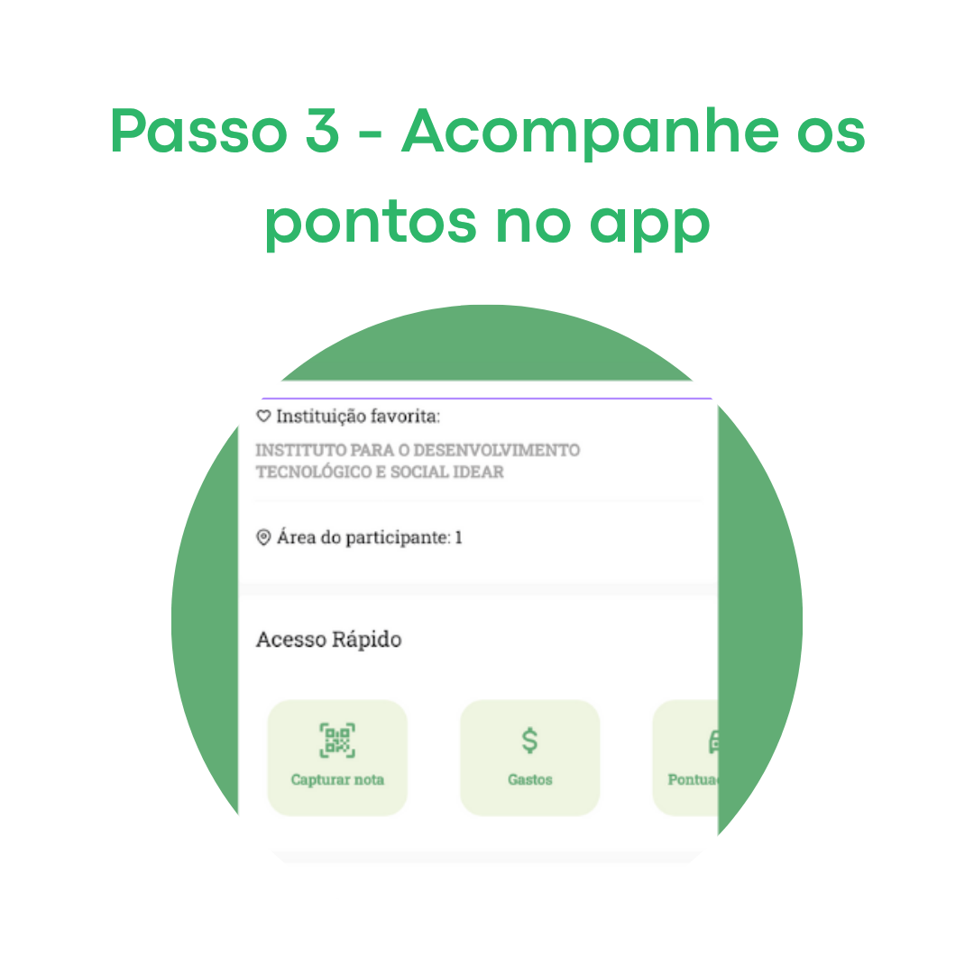 Você pode acompanhar seus pontos e suas notas facilmente através do aplicativo, além de cadastrar outras notas via qr code. Ah, e também dá para ver como estão os pontos da sua instituição favorita.